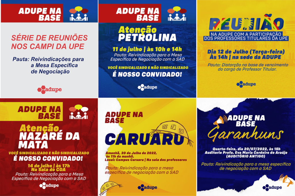 A direção da Adupe iniciou uma série de reuniões com as professoras e os professores em diversos campi da Universidade de Pernambuco. O objetivo é construir, nos próprios locais de trabalho dos docentes, a pauta de reivindicações da categoria a ser discutida com a Secretaria de Administração (SAD).
