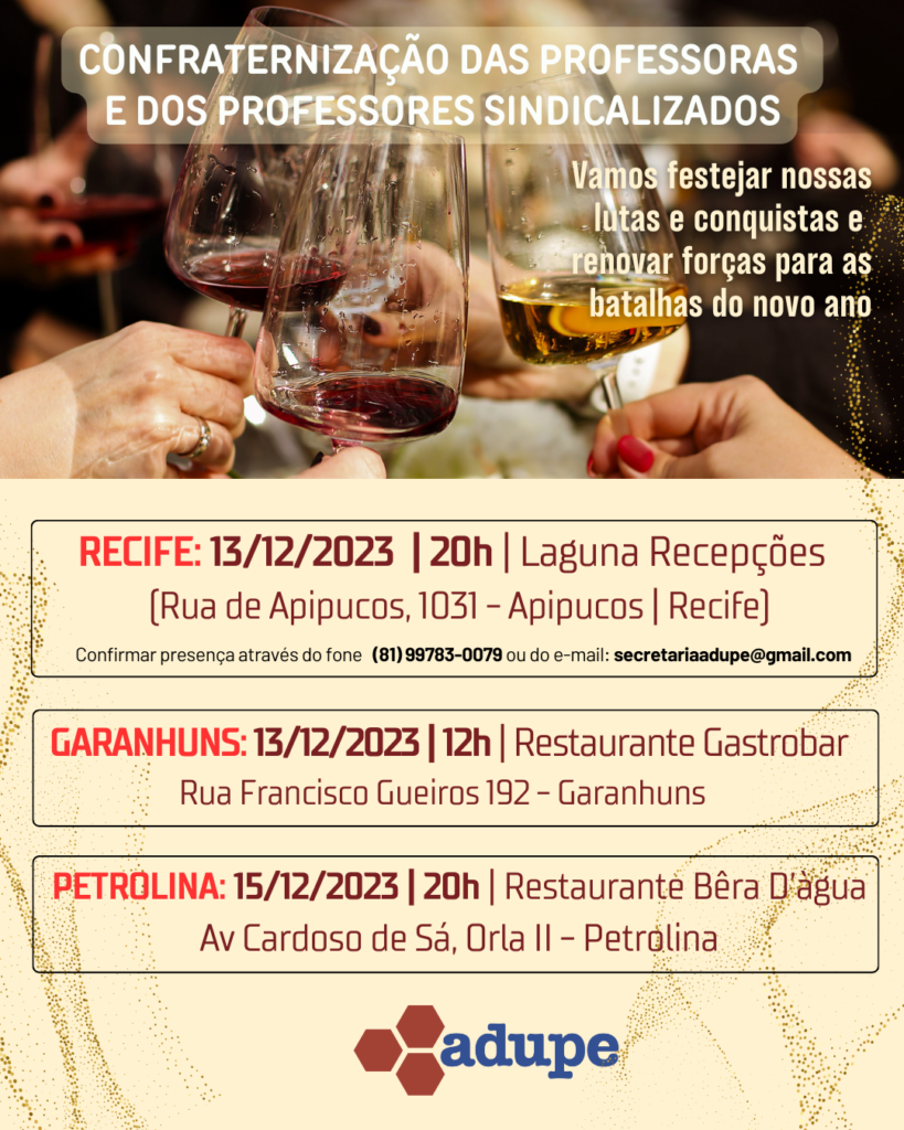 Depois de um ano de muito trabalho, nada mais merecido do que uma pausa para um encontro fraternal de final de ano com os amigos. Contribuindo para que esse momento se concretize a Adupe está promovendo encontros de confraternização para seus associados.