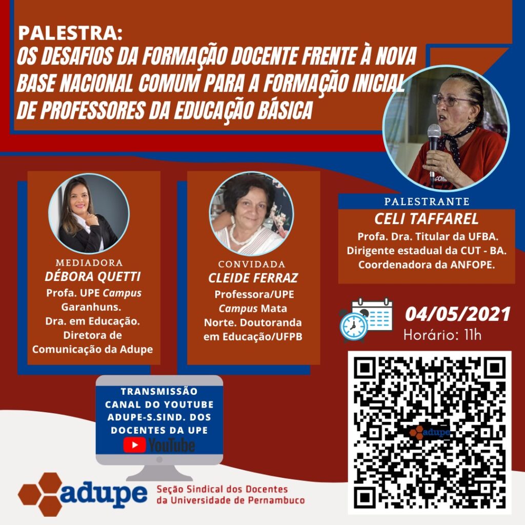 “Os desafios da formação docente frente à Nova Base Nacional Comum para a Formação Inicial de Professores da Educação Básica” será o tema da palestra transmitida pelo canal oficial ADUPE no Youtube, com início às 11h da manhã desta terça-feira (04/05).