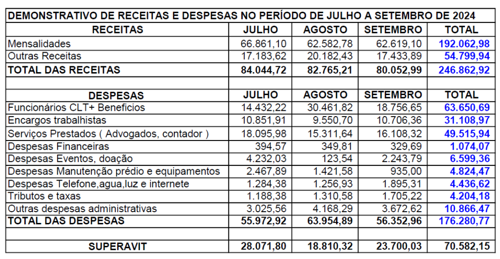 Reproduzimos abaixo os balancetes referentes aos meses de julho, agosto e setembro. O quadro é uma reprodução do resumo das receitas e despesas do período mencionado. Caso haja o interesse, o associado ou a associada poderá solicitar o acesso ao detalhamento dos números.