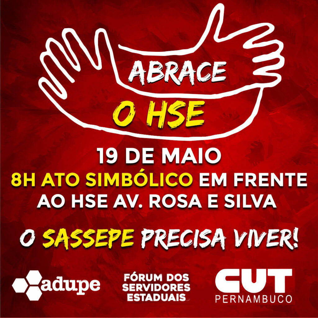 Nesta quinta-feira (19/05), mais um ato dessa luta será realizado em frente ao Hospital dos Servidores do Estado, no bairro das Graças, em Recife. Além da manifestação em prol do HSE, haverá o abraço simbólico da principal unidade de Saúde do Sassepe, que convive atualmente com o desabastecimento de  medicamentos e insumos, cancelamento de cirurgias, falta de manutenção, ambulâncias quebradas, entre outros.