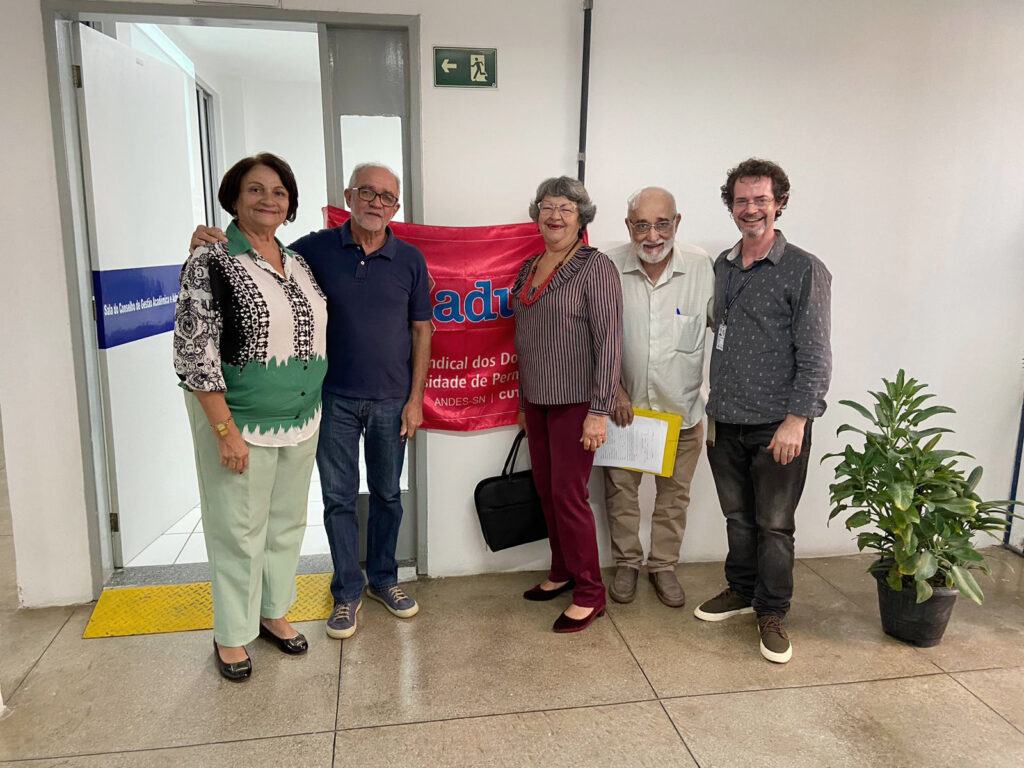 As reuniões com os demais docentes ocorreram ainda na tarde da quinta-feira (03) e na sexta-feira (4). Estiveram presentes Terezinha Lucas e Luiz Oscar Cardoso Ferreira, além dos professores Maria Silu da Silva Caldeira e Francisco de Assis Silva Panta, ambos integrantes do Conselho de Representantes da Adupe (Titular e Suplente, respectivamente).