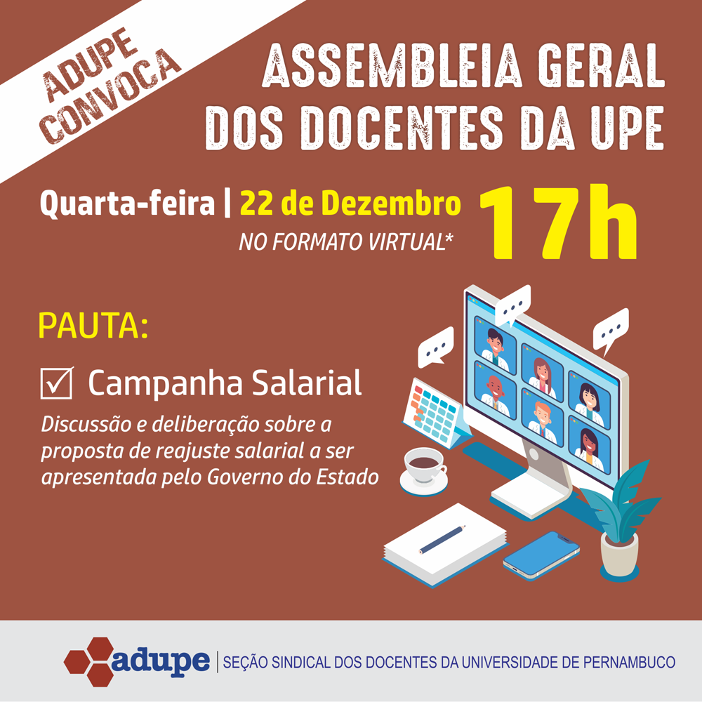 O Diretor Presidente da Seção Sindical dos Docentes da Universidade de Pernambuco – Adupe, no uso de suas atribuições legais, convoca todas as professoras e professores associados para a Assembleia Geral da categoria, nos termos dos artigos 17º e 18º do Regimento da Entidade, a ser realizada no dia 22 de dezembro de 2021, às 17 horas em primeira convocação e às 17h15 em segunda convocação, conforme prevê o artigo 19º. A referida Assembleia será realizada na modalidade virtual, cujo link será divulgado posteriormente, com o seguinte ponto de pauta: