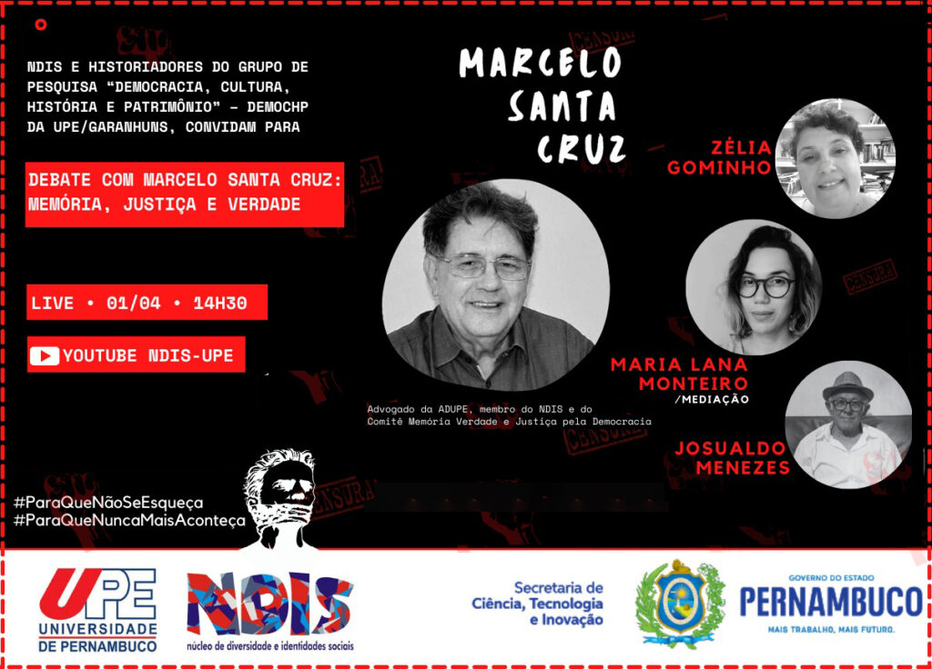 O Núcleo de Diversidade e Identidades Sociais (NDIS) da Universidade de Pernambuco (UPE) e o Grupo de Pesquisa “Democracia, Cultura, História e Patrimônio” – DEMOCHP, da UPE/Garanhuns, promovem, nesta quinta-feira (01/04), o debate Memória, Justiça e Verdade”. O evento será realizado no formato on-line, com transmissão a partir das 14:30h, através do canal do NDIS no Youtube.